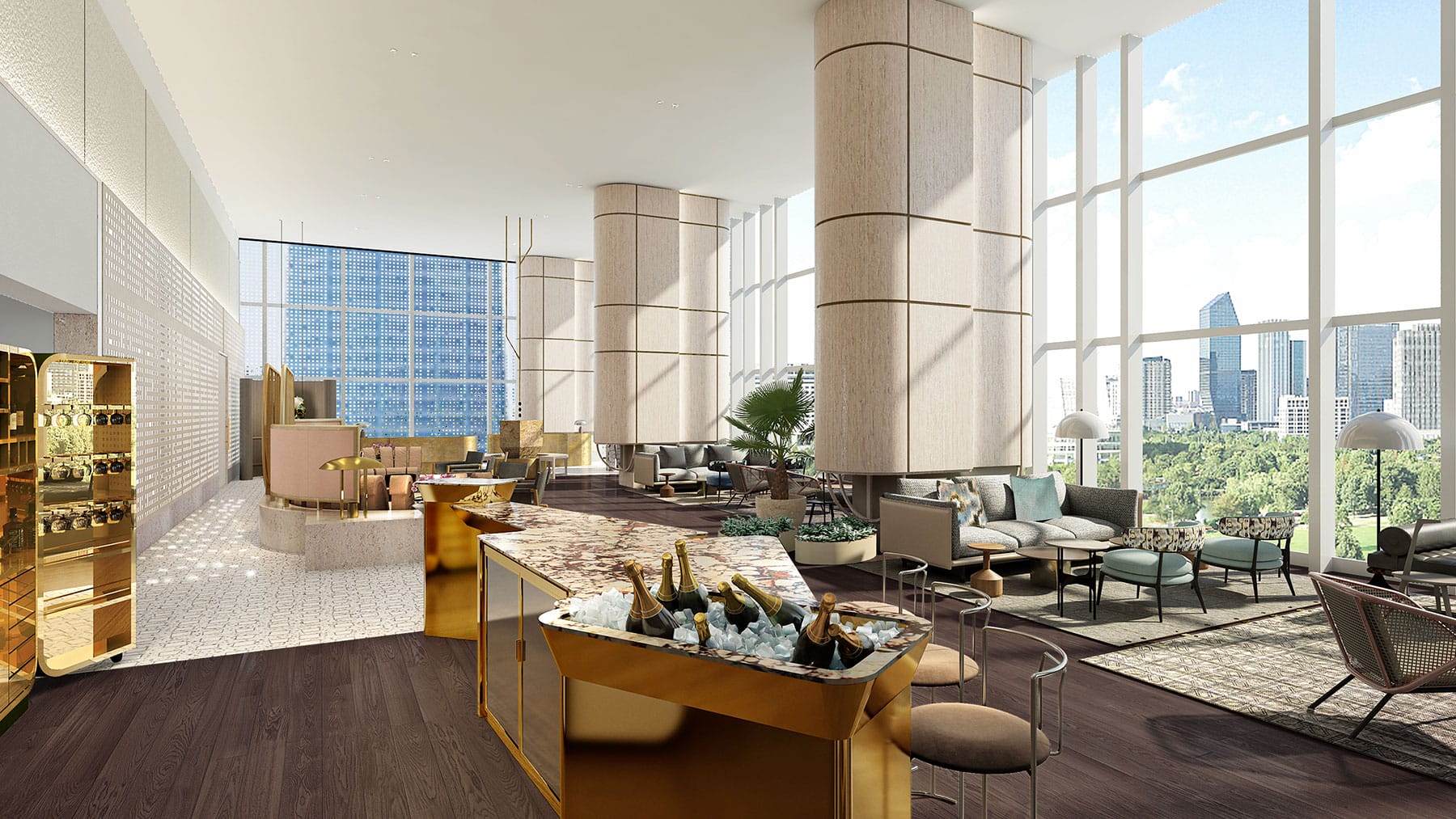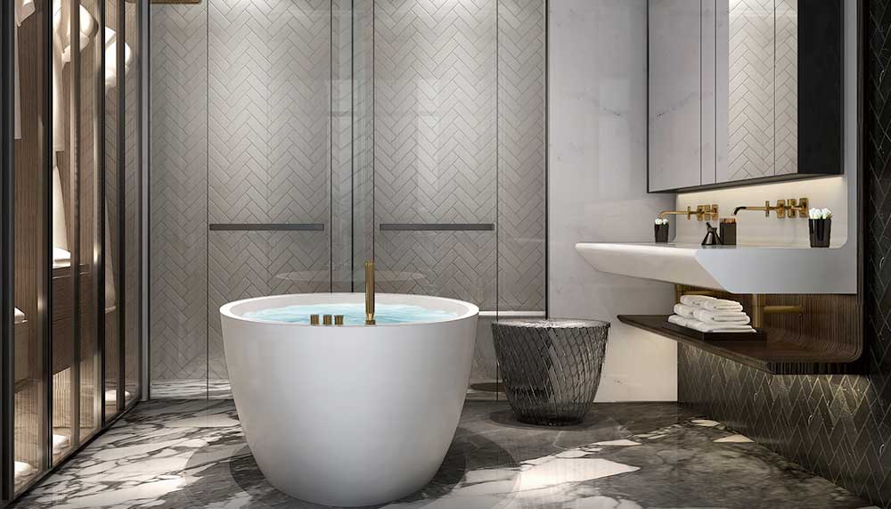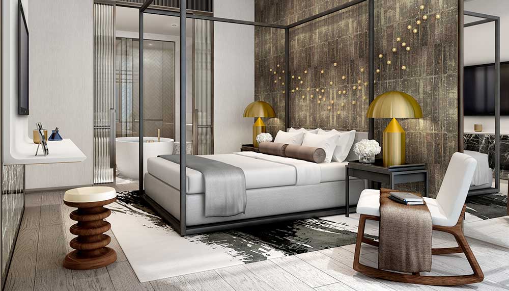 The result, for the YOO8 Tower A, is a lush living experience with the highest level of service. Leung’s design for the residences is split into two, the very Eastern concepts of Wood and Water. Wood is rich, refined and warm, with accents of gold, brass and bronze across the space, which will be fully furnished upon purchase, another nod to the luxury hotel experience. Water is light, airy and jaunty, using a colour palette of white, blue and beige to brighten and visually expand the space. Some common elements anchor both themes – a powder room at the entrance, expansive use of marble in the bathrooms, sumptuous wooden floors and beige-to-blue ombre curtains, Leung’s interpretation of Malaysian batik.