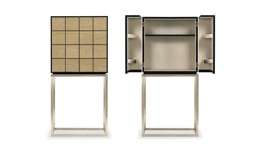 Besides the aforementioned Logo Lamp, established pieces such as the Levante screen, the Jazz and Riesling bar cabinets, the Danzica low table, and the Seine tables in their new Matrix rendition now appear with playful, experimental twists. Beige and brown wood are alternated with rare fabrics, for instance, while metals and lacquered surfaces are masterfully combined with natural materials to enhance their elegance. A reimagining of contours and structures, delivering an airy, weightless quality with ultra-thin layers, seamless lines and enveloping shapes, speaks volumes about Armani’s quest for perfection, as well as his achievements in cultivating a refined, luxurious aesthetic.