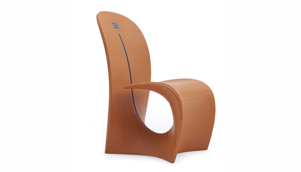 Now a modern version of the chair is making its debut. Created by the Luxury Living Group as part of the new Bugatti Home collection, the Cobra evokes a snake’s posture but also boasts contemporary styling inspired by the Bugatti Chiron. The chair’s frame is a single piece of blue carbon fiber that, save for the seat back, is covered in Cognac leather (other leather options are available). Designed for Luxury Living by another Carlo – the Italian designer Carlo Colombo – in collaboration with Bugatti designer Etienne Salomé, the Cobra (price upon request) also bears the auto marque’s blue leather piping and EB monogram.