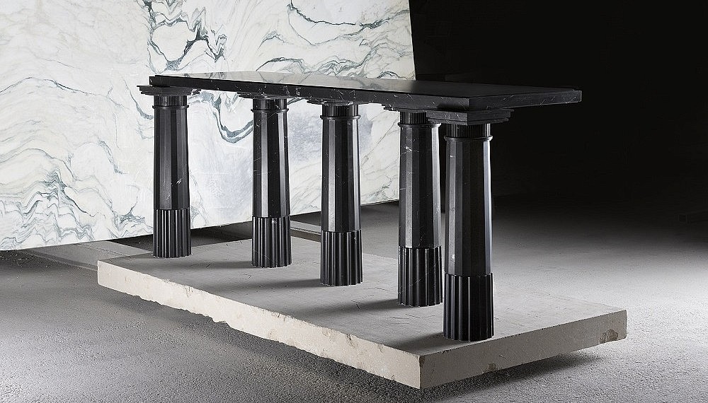 The Architectures series is directly influenced by Greco-Roman design principles, calling on canonical proportions and the golden ratio. This is not a demure gathering of first-attempt work; the Kaiser went headfirst into a strong, disciplined collection. It includes gueridons, tables, lamps, consoles, fountains and mirrors —all influenced by antiquity, which Lagerfeld notes in his quest for beauty and modernity. The precise proportions, exacting columns, and purity in form are all apparent in the space, featuring a strict backdrop of black.