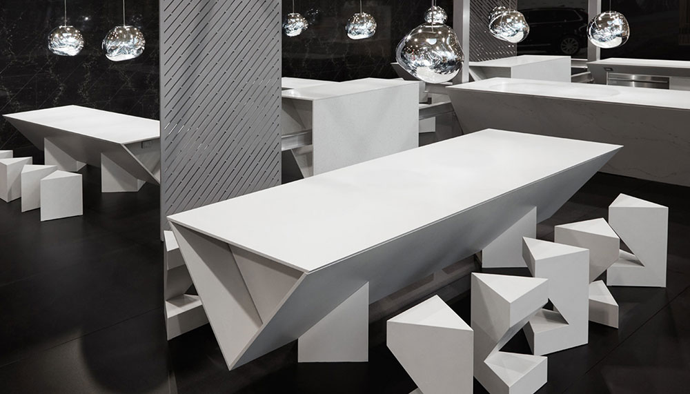 The quartz-surfaces manufacturer Caesarstone and the British designer Tom Dixon have succeeded in crafting a cool-looking kitchen that truly evokes the cold. Called ICE, it is the first of four kitchens inspired by the elements – water, earth, air, and fire – that the company plans to unveil over this year. For inspiration, Dixon looked to Canada’s frozen lakes and the jagged pieces left by the icebreakers. Triangular prisms in different sizes and heights help create the aesthetic, forming surfaces, stools and serving stations.