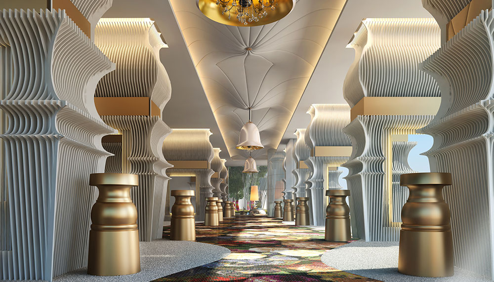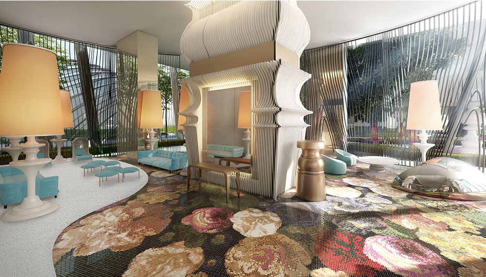 Each of the three residential towers boast their own unique take on French Retro; Tower Three is a sleek vision of glitzy, chromatic highlights with a Rainbow Lounge conceived of a knitted artwork which conveys an impression of colourful-looking ink droplets, hanging from the ceilings. Meanwhile, Tower One takes the breath away with ornate touches of giant framed art, plush carpeting and sinuous, curvy lounge furniture.