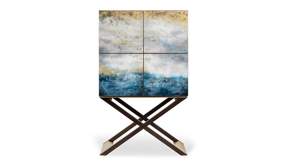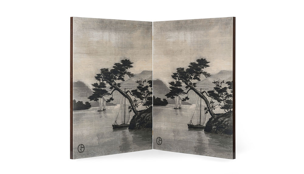Armani’s penchant of creating furniture as micro-architecture showcased this equilibrium to great effect. It’s not difficult to see how several of the pieces may be realised as buildings in their own right; such as the rotating Luna table, which like its celestial namesake, is divided in several phases which can be fanned out thanks to a pivot. Constructed in light-satied brass and a walnut-framed structure, it is adorned with a technical pearl gold fabric base and topped in Himalaya shiny lacquer. The reimagined Club bar cabinet featuring exquisitely hand-painted doors, bringing to mind The Great Wave by Hokusai, finished with an interior of pearl-gold fabric and bronze lacquer.