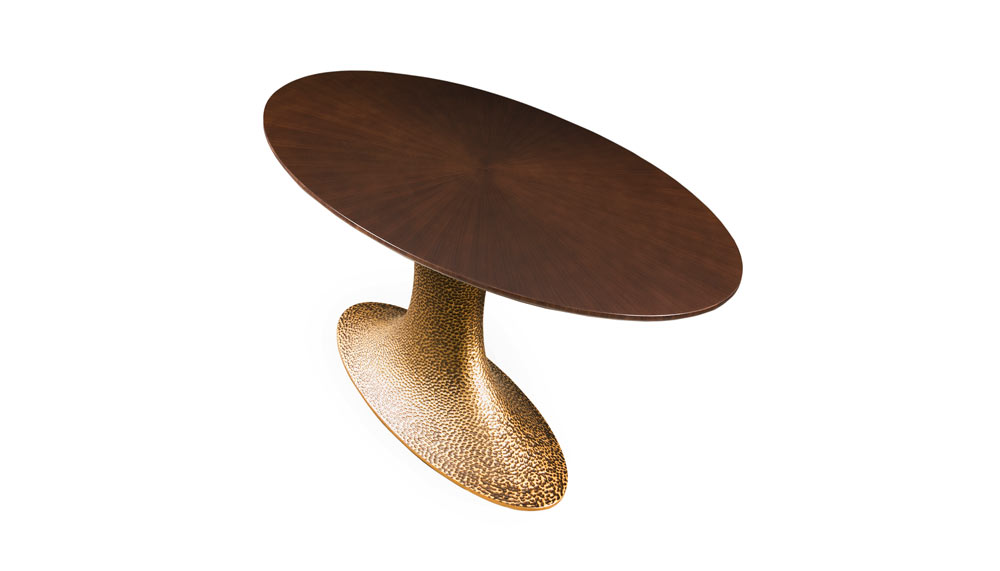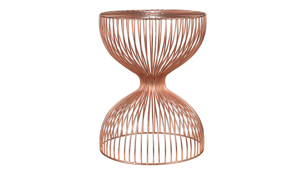 Designed by Simon Legald, Normann Copenhagen’s Era lounge chair with legs in oak, walnut, black lacquered steel or chrome and wool textile or leather upholstery is appealing, nostalgic and well-proportioned, mixing today’s production techniques with traditional furniture craftsmanship. Devoid of straight lines, the Ines Oval table by Hamilton Conte, a brand with a 20th-century aesthetic, features a hammered resin central base available in various finishes and a sunburst marquetry top in oak or walnut veneer. Coming in different colours and emitting a soft glow, Eloa’s Dwarf Planet ceiling or floor lamp conceived by Swiss designer Simone Luling and handcrafted by Bohemian master glassblowers is produced in an unusual rounded form reflecting the irregularities of its namesake celestial body. Celebrating its 30th anniversary, Dutch brand Pols Potten presents its hourglass-shaped Wire Dumbbell stool in copperhued iron wire.