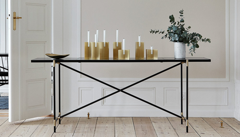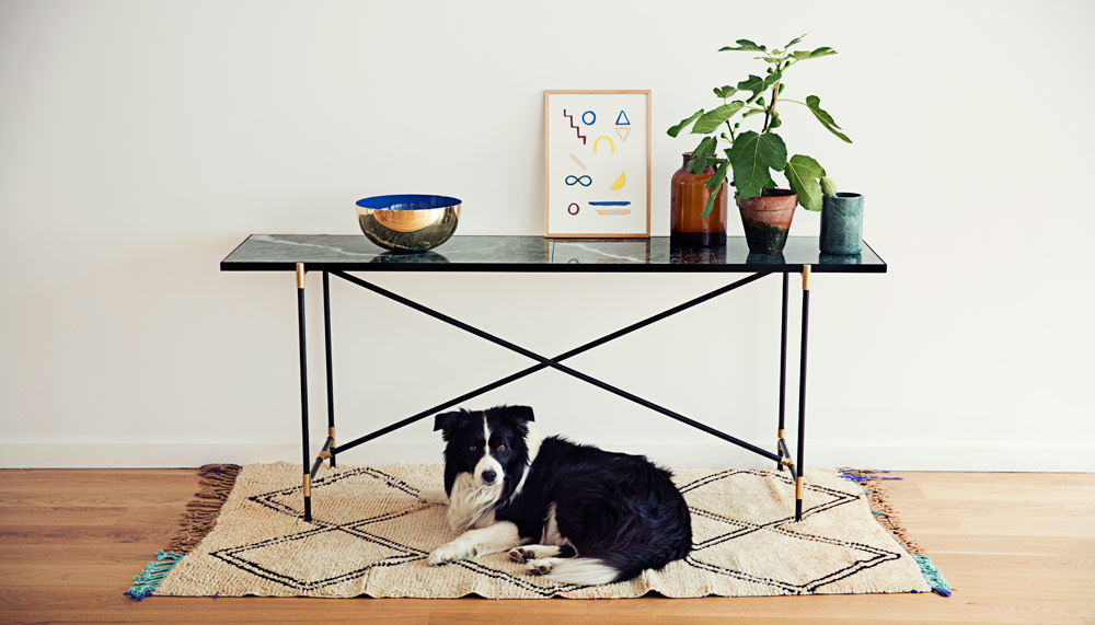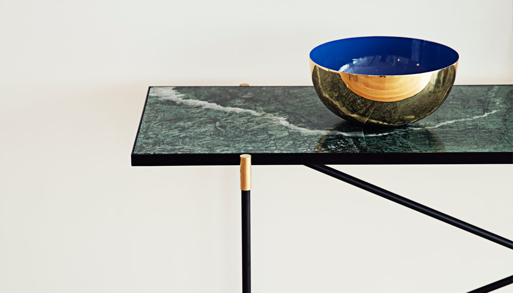 Wanting to make the world less complicated, Menu proposes a Scandinavian aesthetic through its modernist-style Wire Series with a white or black powder-coated steel base and marble top designed by Norm Architects. In lime, pink, blue and white, Gan’s Raw collection of jute and wool rugs, poufs and cushions in smooth, clean lines by Borja Garcia is a statement of simplicity and authenticity in design. Handvark’s creative director, Emil Thorup, has infused his Nordic minimalist approach into the Denmark-made slender Console table with thin black frame, brass details and top in blue-green and grey Dolceacqua marble bringing to mind the reflections of the ocean.