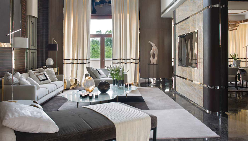 A double-height living area feels at once grand and cosy thanks to a custom wool carpet in a neutral-colour-block style, which the designers laid over the room’s polished stone floor. A whimsical glass table reminiscent of a cloud is topped with two delicate glass ball sculptures by Irene Buarque, and two lacquered fibreglass side tables with gold-leaf embellishments resemble large pumpkins. The brown-velvet chaise lounge and the ivory sofas in velvet and leather create comfortable spots for relaxation. In a pleasant contrast with the cream satin curtains, the walls feature dark ebony wood and chocolate-coloured leather punctuated by gleaming stainless-steel accents.