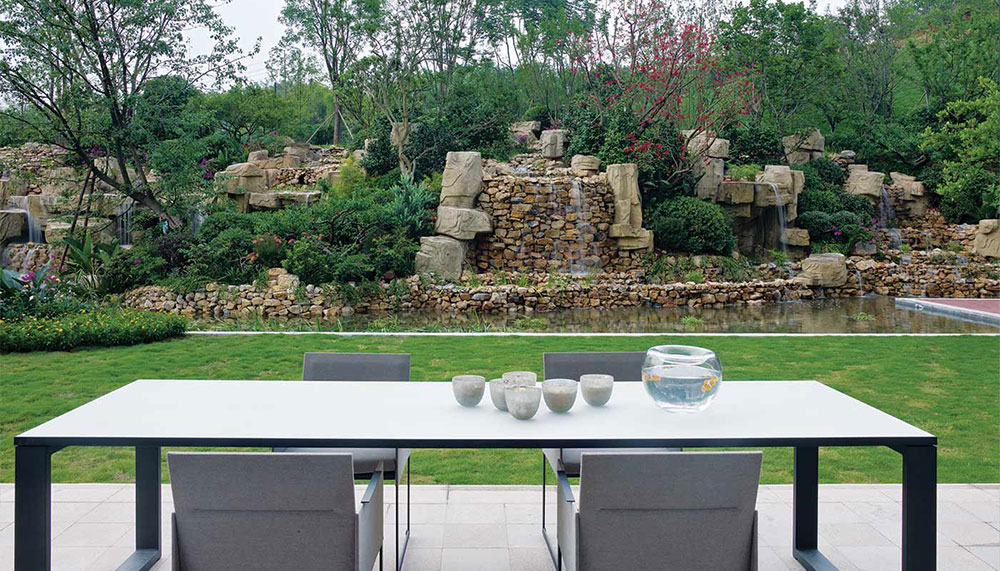 Indeed, the home’s entertaining space is far from sombre. Its various amenities are well suited for lively social gatherings and include a wine room stocked with Portuguese selections and a 650-square-foot indoor swimming pool lined with sea-blue glass tiles that are reflected in the space’s mirrored ceiling. The area, says Wang, is intended to be “the best memory if you had a party.” Adjacent to the pool is a post-dip lounge furnished with custom ivory-leather sofas and a floor featuring a mosaic inlay of locally sourced stone tiles. Ivory-leather curtains retract to reveal glass doors that open to a terrace, where an iron-and-glass table from Manutti awaits an alfresco lunch or dinner.