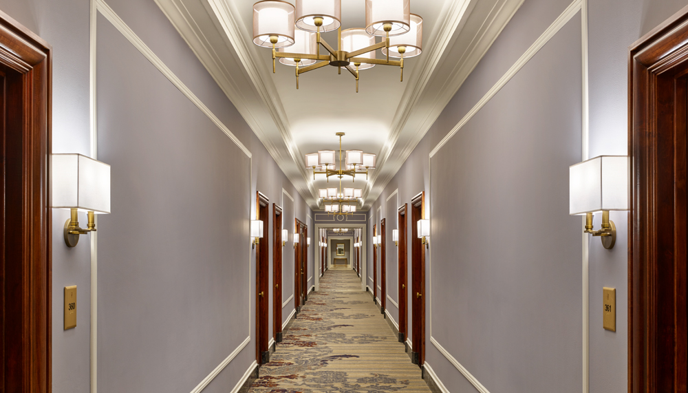Dressed in midnight blue, charcoal, dove grey and plum, complementing leather headboards, dark wood furniture and textured upholstery, the rooms are finished with authentic mouldings and solid oak doors that feature original brass monogrammed knobs from 1909.