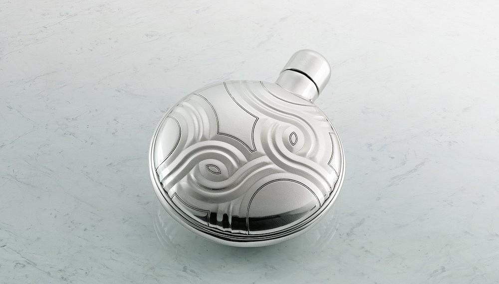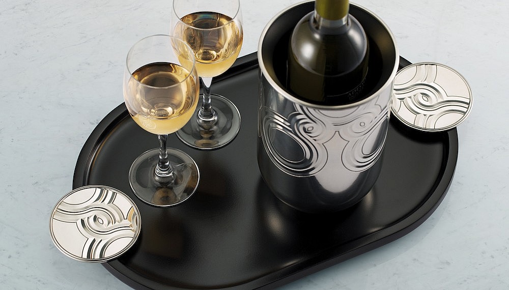 In Streamline, the glamourous glitz of the roaring Twenties is channeled into a series of home decor items. Inspired by the sweeping Art Deco movement – all chevrons, starbusts and exuberant geometric patterns – Streamline takes specific reference from a rug designed by textile designer extraordinaire Marion Dorn (1899-1964). Dorn came to England from San Francisco in the early 1920s and by the mid-1930s, was considered a leading extile designer. She carried out commissions for London hotels like Claridge’s and the Savoy, and for the ocean liners Orion and the Queen Mary. The focus on her fluid concentric curves here are typical of the bold luxury of Art Deco, and specifically its nautical use, translating beautifully onto pewter. The collection consists of a valet tray, serving tray, trinket box, pendant, candlestand, hip flask and bottle chiller.