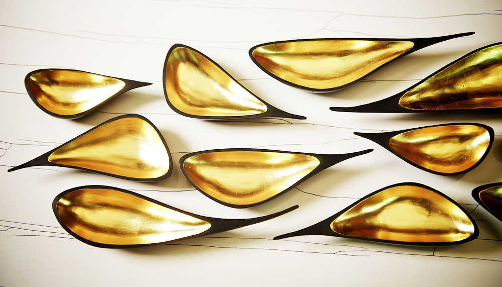 The THALIA collection is slightly more geometric and sculptural, though subtle elemental touches still surface. The Daisy Candle Stand, for example, looks like a magnified section of coral, with graceful bronze trombones holding shining candles. How about the Ranchu bowls, mesmerizingly seedlike? Or the Water Drop Bowls, looking like golden cracked eggshells.