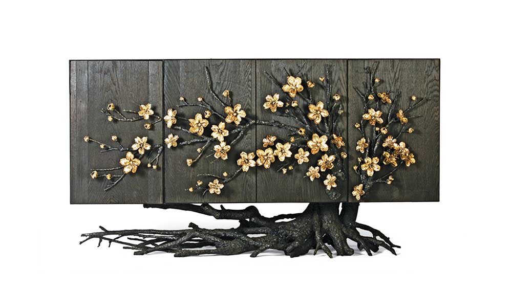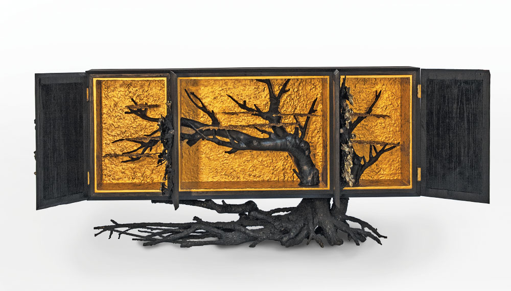 Close inspection of the burnt-oak cabinet reveals the handiwork in the exterior’s leaves and blossoms and in the interior’s gnarled branches, some of which are shelves. A wax sculpture of the tree precedes a plaster mould that ultimately is cast in bronze. Inside, the cabinet glows with a paint made from powdered gold—a sheen that recalls the gilding on Buddha statues and Thai temples. “When you open the cabinet,” Termviriyakul says, “you can feel a dramatic, warm gold colour come out.”