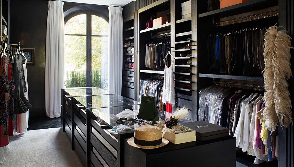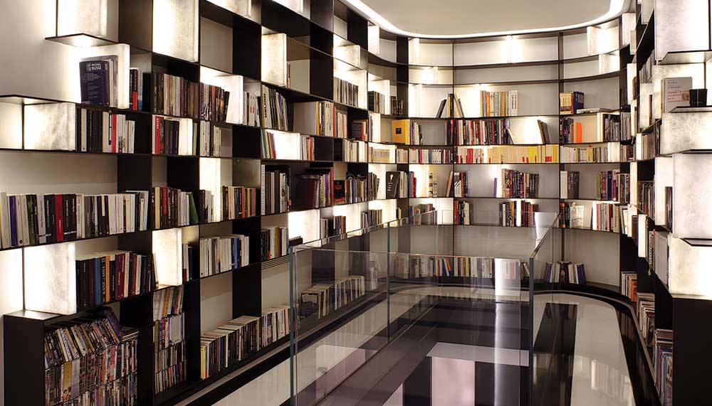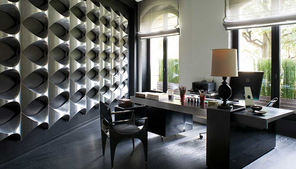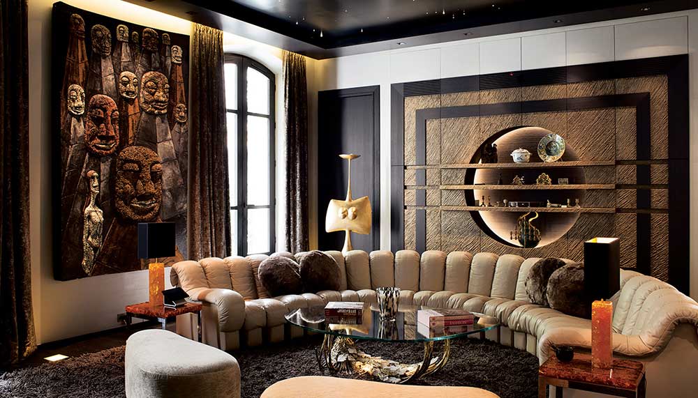 A winding staircase with backlit treads leads up to the private areas of the house. The master bedroom has a pair of comfortable armchairs by Pierre Guariche – one in black and the other in white – and starry-night ceiling panels similar to those in the media room. Gastou notes that the library, which is located at the top of the stairs, has a 1930s look and feel in the manner of the French designer Pierre Chareau, thanks to its touches of alabaster and black lacquered metal. A glass balustrade in the centre of the library surrounds an opening to the foyer below, and in the office, with its Willy Rizzo desk and Philippe Hiquily armchair, a large wall-mounted metal grille dominates.