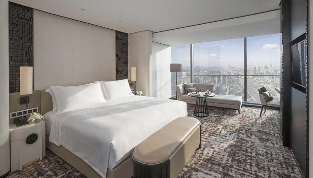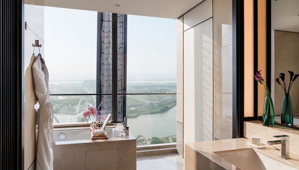 In the suites, however, the most memorable interior design details lie in the expansive marble bathrooms complete with separate dressing tables. Deep, bowl-like soaking tubs lie next to floor-to-ceiling windows overlooking the modern Nanjing Eye Pedestrian Bridge stretching over the Yangtze River.