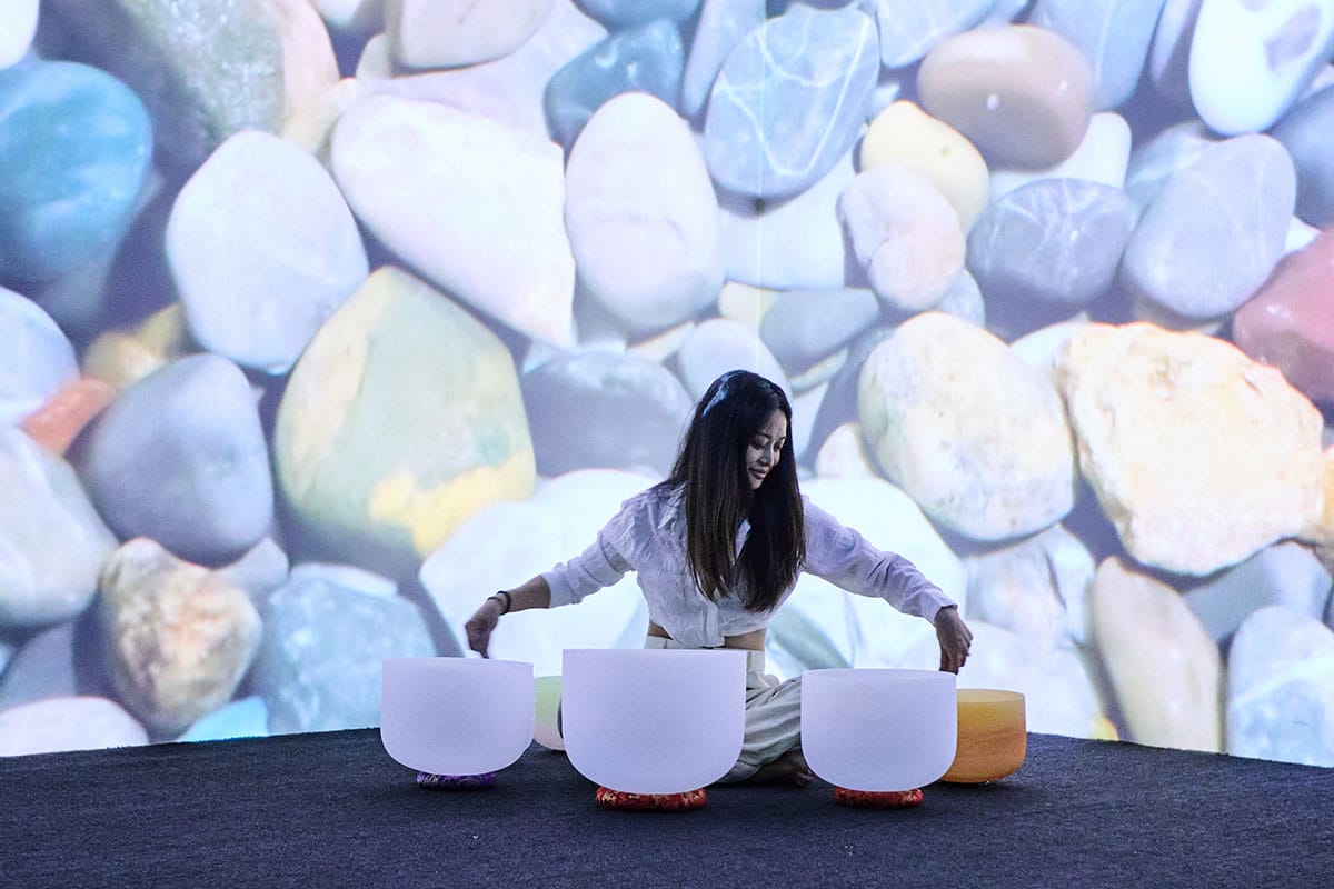 Framed by four core pillars—Wealth, Health, Travel, and International—the updated HSBC Premier services cover wealth solutions, health and travel privileges, and enhanced accessibility in international banking. To bring these pillars to life, the launch showcase unfolded through a series of visually immersive concepts. The experience began with an HSBC-branded entryway, enveloped in layers of hibiscus blooms. From there, Wealth shimmered with golden illustrations to evoke prosperity; Health featured a textured pebble backdrop accompanied by a live sound bath; Travel transported guests through large-scale moving visuals of iconic landmarks; and International concluded the journey with a globe-themed setting.