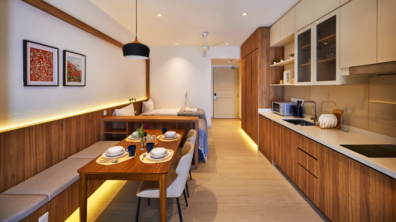 The living spaces are thoughtfully built to prioritise residents’ comfort and safety—from spacious rooms and wheelchair-accessible features to ramps, minimal steps and practical amenities such as panic buttons and bathroom handrails. Accommodation options range from 465 to 878 sq ft, appointed with soothing colours, natural light pouring in through wide windows, and panoramic views from the balcony. Chia also elaborates on the decision to employ a lease-only business model at Millennia Village: “The primary consideration for us was maintaining full control over our tenant profiles and the entire facility.” Unlike the easier route of building and selling, the lease-only model requires upfront investment, akin to equipping a fully-fledged hotel. “My father and I shared a vision of not burdening families with debt,” Chia adds. “By leasing only, we ensure our rental rates are affordable for our tenants and we can safeguard the community’s intended demographic.”