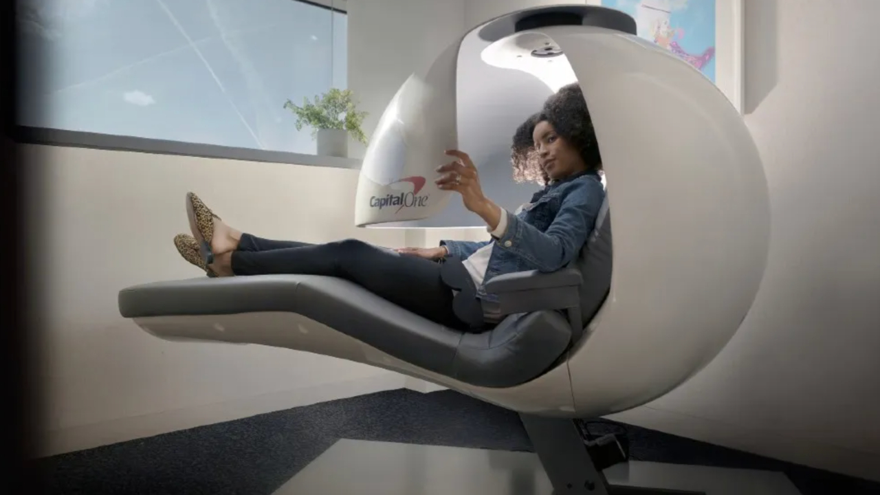 It’s not just the impressive variety of food and drink that makes Capital One’s first-ever airport lounge in Dallas worth a stop. The lounge also includes a dedicated “wellness corridor,” housing some rather unique elements, including a workout space, nap pods, prayer rooms, a nursing chamber, and a shower suite. For travellers looking to break a sweat before (or in between) flights, grab a yoga mat or hop on one of the two Peloton bikes. If rest is more the mood, a dedicated nap area is customized with a ceiling mimicking stars in the sky. Also on the wellness menu are sumptuously padded eye covers and blankets, helping travellers recharge away from the crowds.