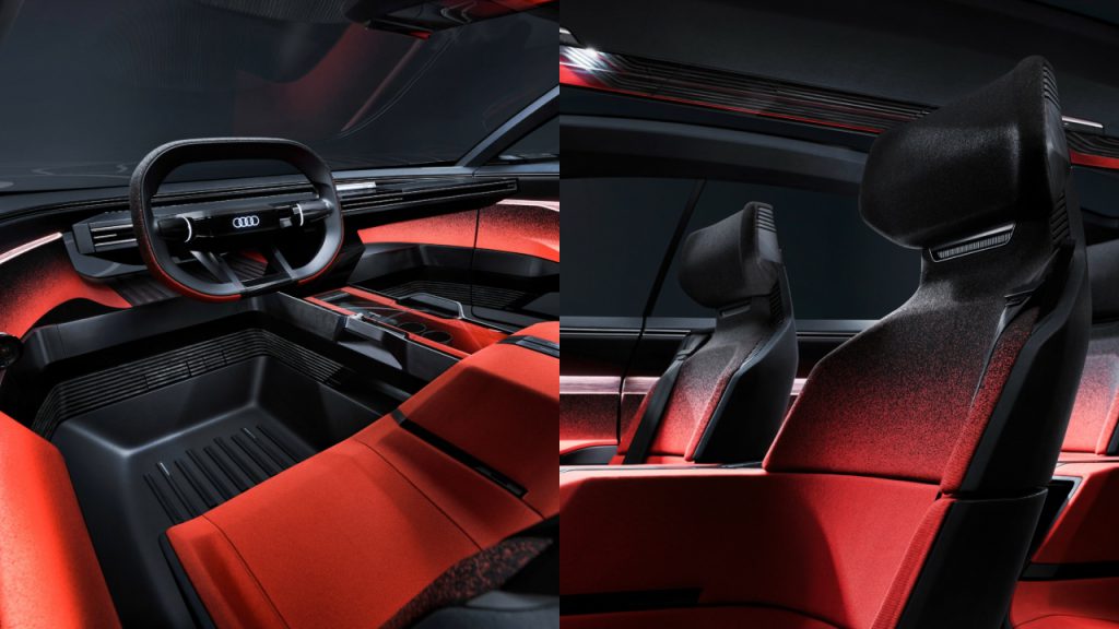 Activesphere’s cabin—or “sphere”—is even more impressive. The red-and-black interior looks like the cockpit of a spaceship, only without any screens. They’re not hidden away, either. Instead, the vehicle comes equipped with four augmented reality (AR) headsets that the driver and passengers can use to view relevant information or entertainment options via the “Audi dimensions” interface. Like other “sphere” concepts, the Activesphere is designed to be autonomous, but when the driver wants to take over, a steering wheel protracts from its otherwise spartan dashboard.