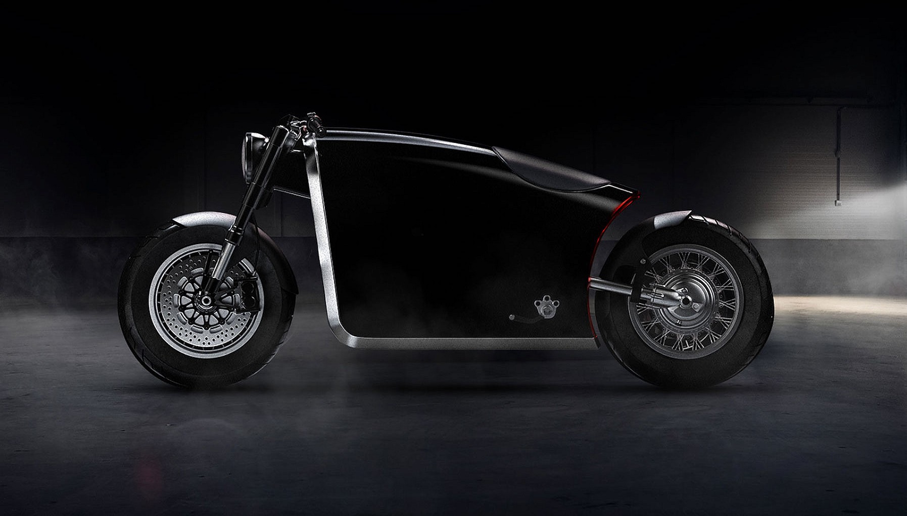 The company’s new motorcycle is the latest entry in the continuing Eve project. It’s easily the most streamlined entry in the series yet. Gone are the retro-futuristic flourishes of past Eve models, replaced by a minimalist monocoque structure that houses the bike’s headlamp, steering controls, gas tank and seat. Connected to the body of the bike is a telescopic fork and a bespoke L-shaped, single-sided swingarm equipped with an engine and a mono-shock.