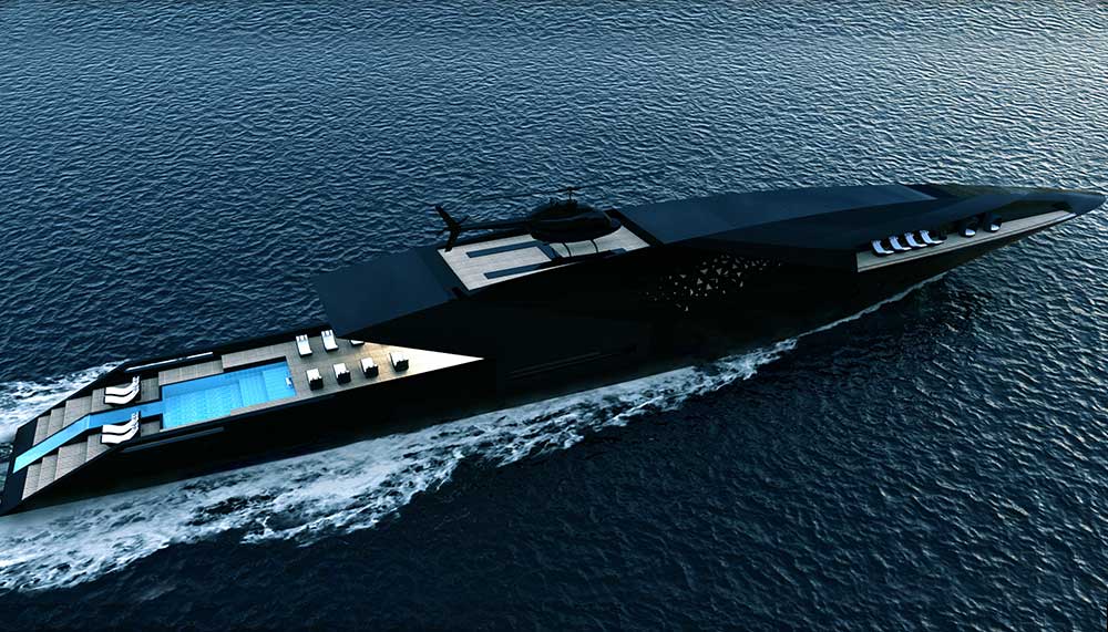 Rarely is a yacht described as dramatic, yet that is the perfect adjective for the Black Swan Superyacht Concept. Designed by Turkish designer Timur Bozca as ‘the powerful image of an arrow’, the Black Swan is a formidable torpedo of a superyacht that is guaranteed to cut a striking figure at sea or at marina. Midnight black and menacing, it sails to the mental soundtrack of Darth Vader’s March from Star Wars.