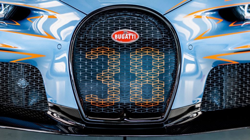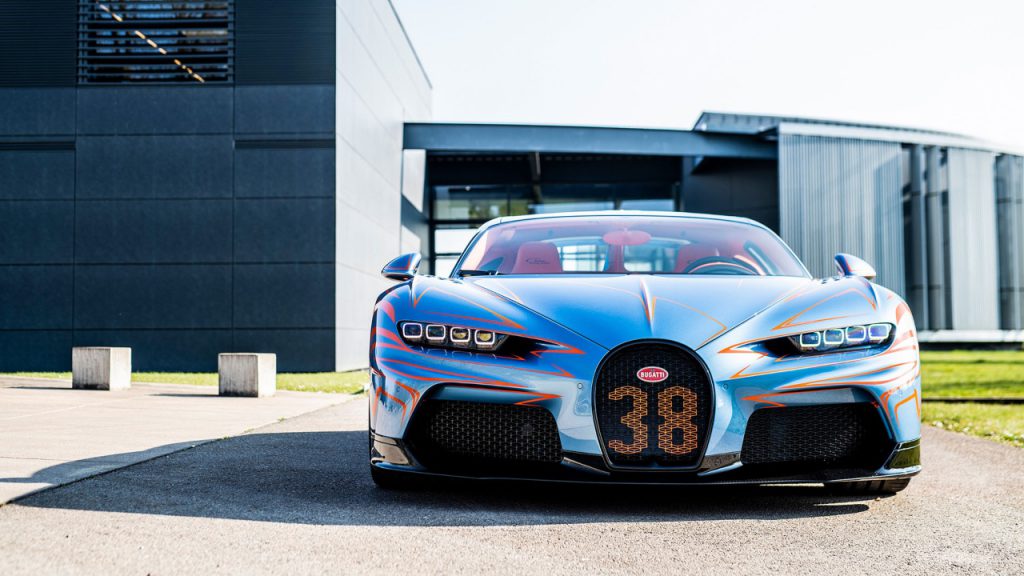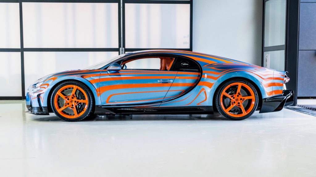 To accompany the announcement, Bugatti also shared photos of one of the first examples to roll off the line at its Molsheim Atelier. The Chiron Super Sport’s sleek, low-slung body has been finished in a bespoke “Vagues de Lumière” paint job that was dreamt up by its unnamed owner and the marque’s Sur Mesure team. The intricate, hand-painted design features orange speed darts over a metallic blue base and is complimented by a set of five-spoke aluminum rims done up the same bold hue. Open its doors and you’ll find an orange leather interior offset by aluminium and carbon-fibre trim and accents.