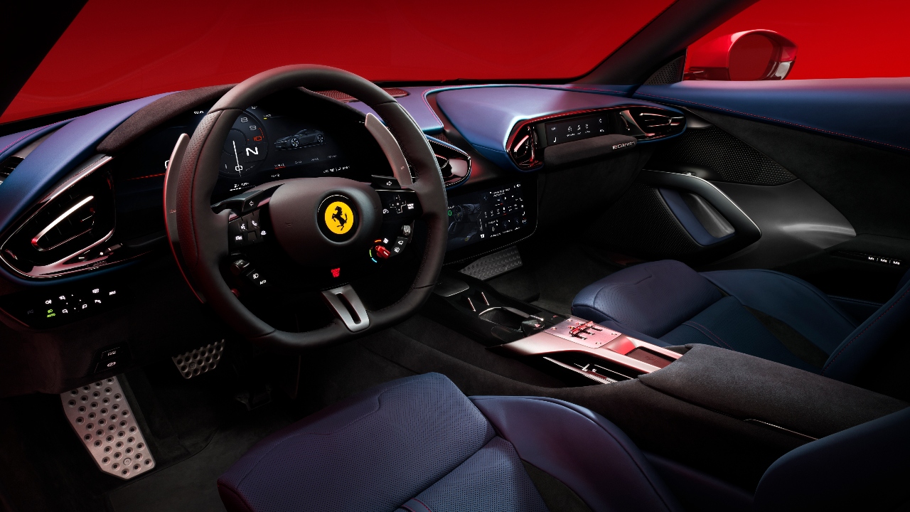 A subtle take on a semicircular indent line—another Ferrari signature—sweeps the perimeter, anchoring voluptuous fenders and accentuating the vehicle’s length. Wheel arches are stuffed with 21-inch forged alloys wearing Michelin Pilot Sport 5 S tires. Things get wilder toward the rear. A carbon-fiber-capped greenhouse incorporates a rear windscreen, the latter featuring a triangular shape inspired by an aeronautic flybridge. The blacked-out windscreen flows into a pair of electrically powered flaps that rise to 30 degrees to boost aerodynamic downforce. The rear winglets bookend a fixed center spoiler intended to create a full-width “blade” effect. Then there’s the four gem-like taillights, a departure from Ferrari’s round illumination of yore.