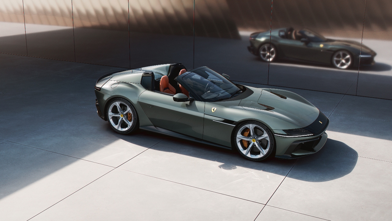 At Ferrari’s Centro Stilo, we were surprised by another debut, that of the 12Cilindri Spider in a fashionable coat of Verde Toscana (“Tuscan Green”). The hardtop convertible adopts the 296 GTB hybrid’s space-saving roof design, opening or closing in 14 seconds at speeds up to 28 mph.