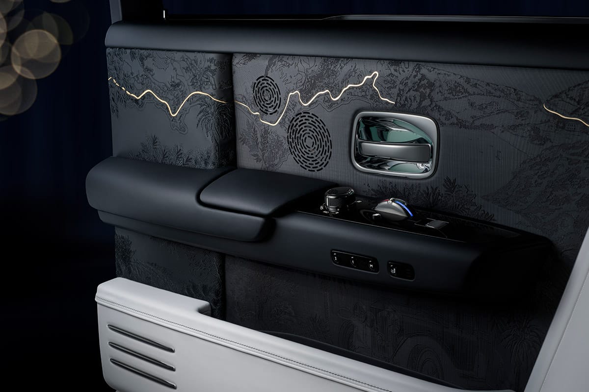 Based on the latest Phantom VIII extended-wheelbase variant, the sedan features an interior that’s a montage of key events, people, locations, and classic examples featured in Phantom’s legacy. This includes everything from a map of roads driven by company co-founder Sir Henry Royce at his winter retreat in the South of France, depicted in strands of 24-karat gold, to Rolls-Royce’s original showroom in London’s Conduit Street that’s portrayed as part of a rear-seat tapestry embroidered with over 160,000 stitches.