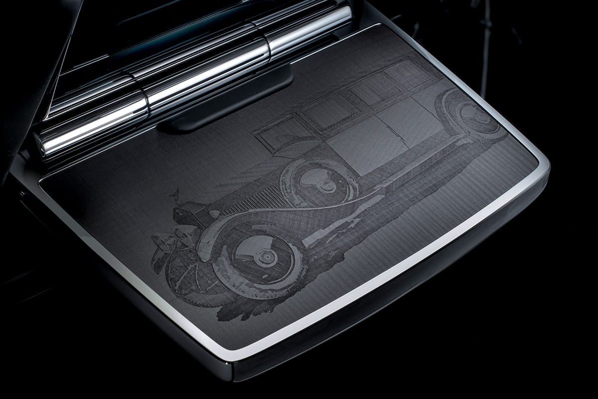 The panels on each of the Phantom’s four doors, formed from stained Blackwood veneer, are claimed to be the most intricate pieces of woodwork ever created for a Rolls-Royce. Each one was crafted using ground-breaking new techniques in 3-D ink layering, 3-D marquetry, and laser etching.