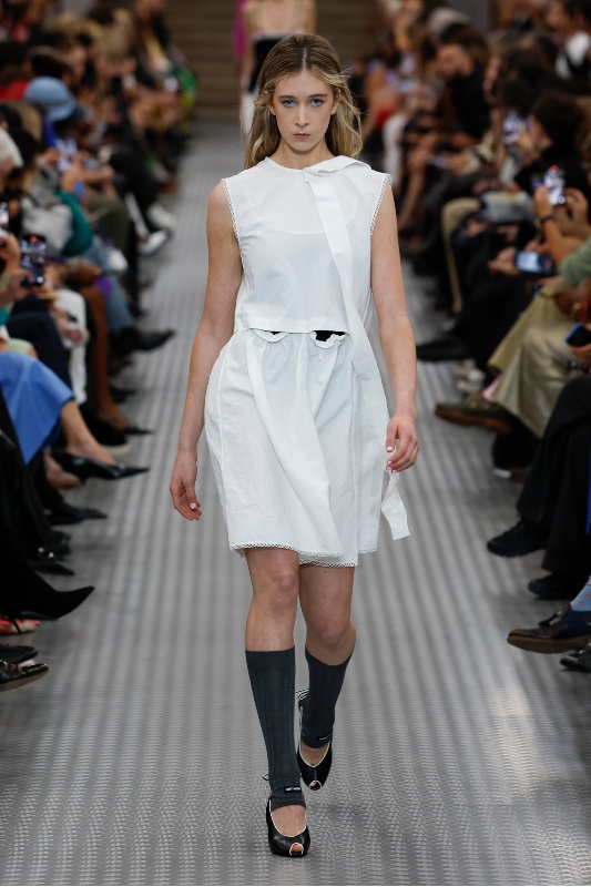 Titled ‘Salt Looks Like Sugar’, Miu Miu’s new collection explores the transformative journey of youth through six evocative stages. It begins with the nostalgia of childhood, showcasing delicate pieces like a crisp white cotton dress created in collaboration with Petit Bateau, the iconic French children’s clothing brand. The narrative transitions into the experimental teenage years, reflecting the spirit of self-discovery, before gracefully maturing into sophisticated overcoats and refined pencil skirts. Throughout the collection, Miu Miu blurs the lines between these stages, playfully mixing and matching pieces in a celebration of individuality.