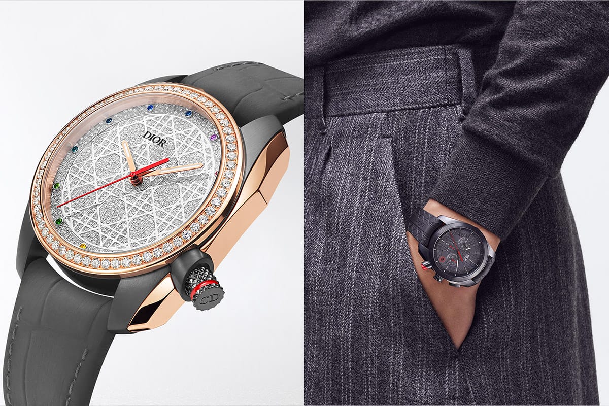 The limited-edition watches celebrate Monsieur Dior’s favourite grey, which he viewed as the ultimate symbol of elegance. These couture-inspired objects of desire are presented in three ultra-contemporary variations. The first is a monochromatic timepiece punctuated by signature scarlet details in a 38mm case and a pared-down design. It is equipped with a high-precision automatic mechanism, with its rotor adorned with the Dior logo, along with emblematic graphics. This model is also crafted in a 41mm chronograph version—an exceptional timepiece containing a movement able to measure up to a 10th of a second. As a final surprise, the collection is further enriched by a third version, limited to only 20 pieces. Paved with diamonds, this timepiece combines a rose gold bezel with a white gold dial, distinguished by a subtle Cannage motif. Testifying to the meticulousness of the artisans, the coloured gemstones on the hour markers add a distinctive touch, while a grey alligator strap completes the captivating creation, allying expertise and sophistication.