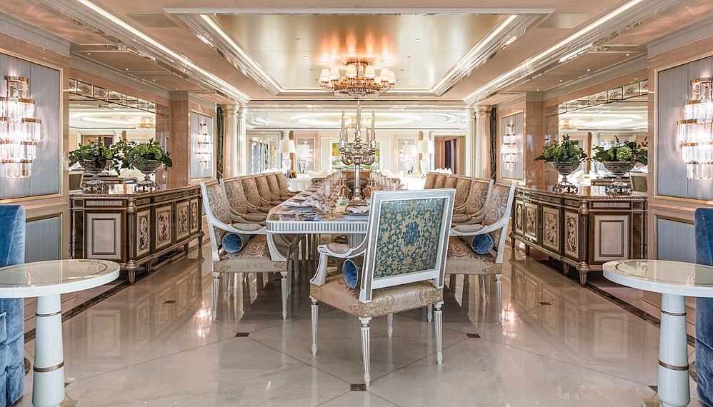 Also on this level are the galley and dining saloon. In the dining area, Winch finished the traditional French chairs from Paris-based Rinck with a special lacquer and gilt details, upholstering the furniture in Italian silk by Rubelli. The ceiling panels are covered in faux-ostrich embossed leather, and the dining room’s ceiling features the same gold leaf used in the main saloon. “The owners are wine collectors,” Jolly says, “so we installed two huge wine fridges — one for white and one for red, port and starboard. It’s quite unique on a yacht to have such a substantial collection.” Winch also created a custom table from several different woods and placed it beneath the seemingly free-hanging Preciosa light fixture. Two VIP guest rooms with marble en suites also occupy the main deck.