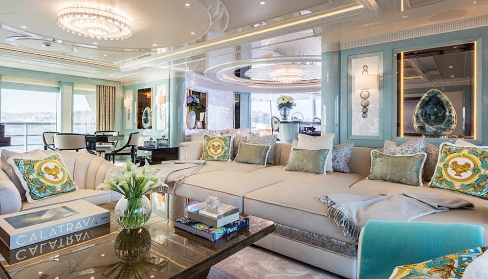 To achieve a homey feeling, Winch’s Greig Jolly and the design team moved wherever possible away from fixed furnishings and decor — which are typical of yacht interiors. “We tried to keep the furniture eclectic,” Jolly says, “avoiding things being too similar. We wanted to give the feeling of pieces collected over time and make them seem individual.” They sourced furnishings from Italian and French suppliers or asked their own team to craft custom pieces using fabrics from Rubelli, Pozzoli, Armani/Casa and Versace. They also experimented with bleaching and unusual staining on the curly-maple veneers used throughout the rooms.