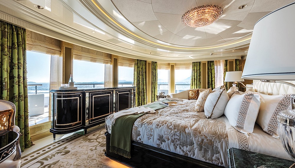 The master-bedroom suite, which has direct access to the foredeck, stretches across the width of the yacht. The palette of greens, metallics, and neutrals is mirrored in the Rubelli curtains and the custom rug. A hand-painted silk wall covering, sketched by Winch and produced by Fromental, pictures birds on a blossoming tree. Decadent his-and-her en suites feature sand-etched glass panels crafted in Germany that enclose spacious showers, with vanities fronted by sun-catching rock crystal.