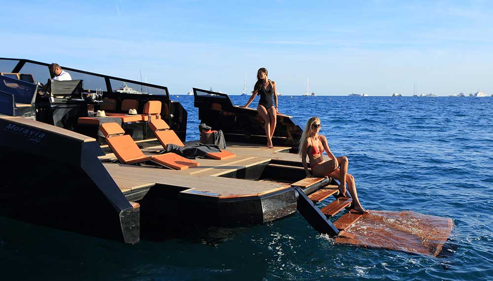 Those performance numbers are impressive enough for an express cruiser, but the transformative cockpit is the real star of the show. In open position, the deck measures 25 square metres – 40 percent larger than in its closed position. Controlled by a smartphone or a tablet, the sides of the hull open in less than a minute. The back panel – operated by a separate crane-like mechanism – can be raised upward and tilted backward to let a guest step aboard from a dock, or it can be lowered more than a metre into the water to allow swimmers to get back into the yacht without struggling. For even more shape shifting, the 43’s modular seats can be rearranged in different configurations or done away with altogether for a completely open deck. And an outdoor galley (with an induction stove, sink, and refrigerator) can be hidden away into the side of the cockpit.