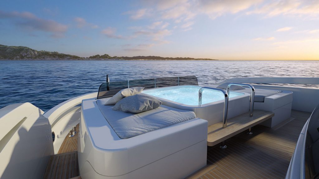 The semi-displacement yacht features a sleek, sporty exterior conceived by Guida and will be forged from a mix of GRP and carbon fibre. The interior, meanwhile, was penned by Milanese studio Hot Lab and is characterised by “soft, embracing shapes” and natural materials, according to the yard.