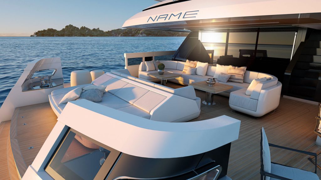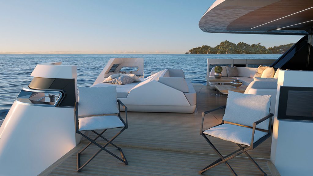 One highlight of the yacht is the cockpit on the main deck. It sports two foldable balconies that expand to offer more than 800 square feet of extra space. All up, the area offers three sofas, a sundeck and views of the hydraulic swim platform below.