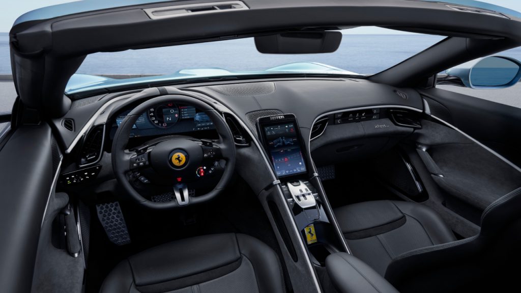 The Roma’s turbocharged 3.9-litre V-8 has been left untouched—and with good reason. It’s mated to an eight-speed dual-clutch automatic that sends 612 hp and 561 ft lbs of torque to the rear wheels. No performance numbers were mentioned, but the coupe can rocket from zero to 62 mph in 3.4 seconds and has a top speed of 199 mph. The convertible will probably be a tad slower but still in the same neighbourhood.