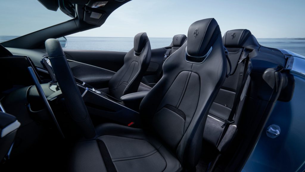 The interior has received some subtle reworking, too. The front, with its leather seats and 8.4-inch vertical infotainment touchscreen, remains the same, but a wind deflector has been integrated into the backrests of the rear seats. It can be deployed at the touch of a button, but only if no one is sitting on the cramped rear bench. The new element reduces wind noise when the top is down. When it is up, Ferrari says its multi-layer fabric material provides the same “acoustic comfort” as the removable and retractable hard-tops it usually uses.