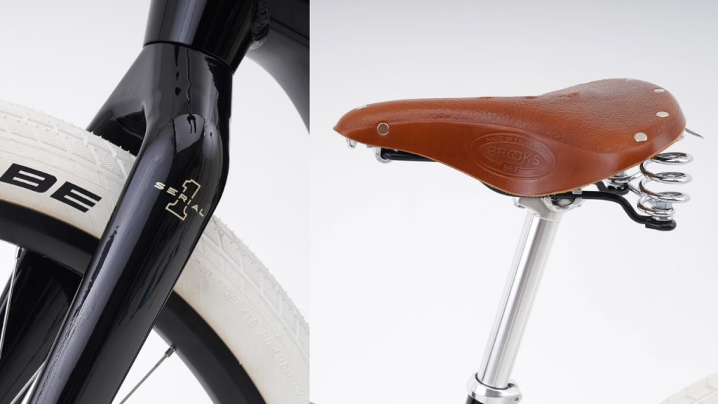 The e-bike, which is available in three sizes to accommodate riders of different heights, features a glossy midnight black paint job. Its white Schwalbe Super Moto-X tires, made exclusively for Serial 1, were designed for low-rolling resistance and good shock absorption. Meanwhile, the model’s hand-crafted leather seat and matching grips, made by Brooks England, add a nostalgic touch to the design.