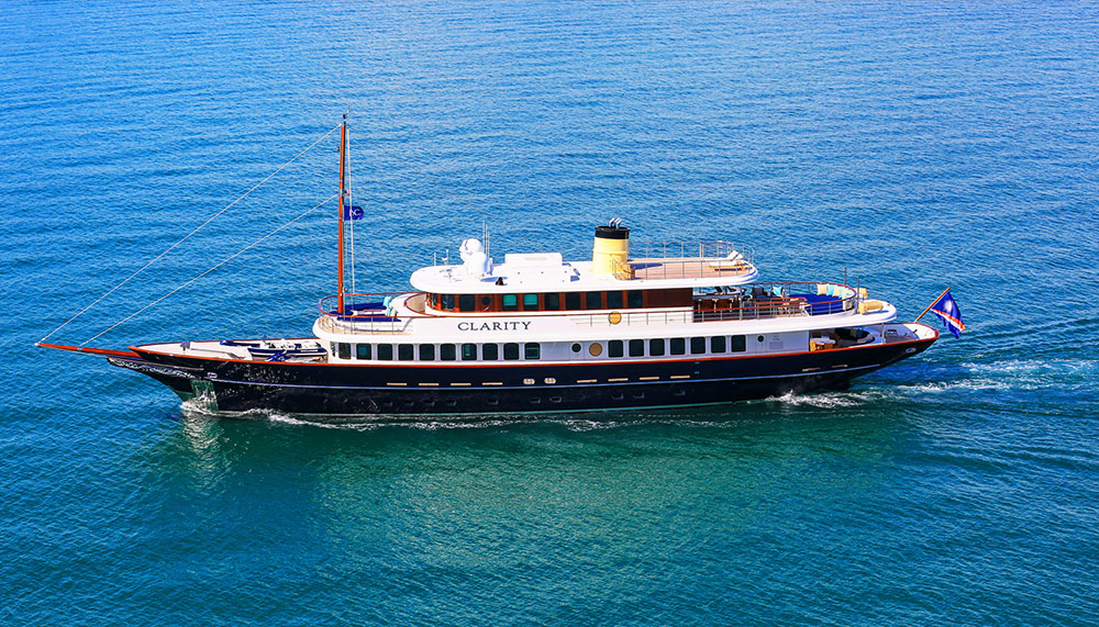 Clarity is a prime example of the yard’s ability to craft impeccable woodwork, ranging from the exterior teak decks to the gleaming mahogany used both in the pilothouse and as trim wrapping around the edges of the outer passageways. A wooden foremast and long bowsprit further enhance the yacht’s classic look without nudging it into kitsch territory. Clarity’s social areas include an upper deck with sunbeds, a Portuguese bridge with more sunbathing islands, an outside bar, and an aft cockpit for alfresco dining.