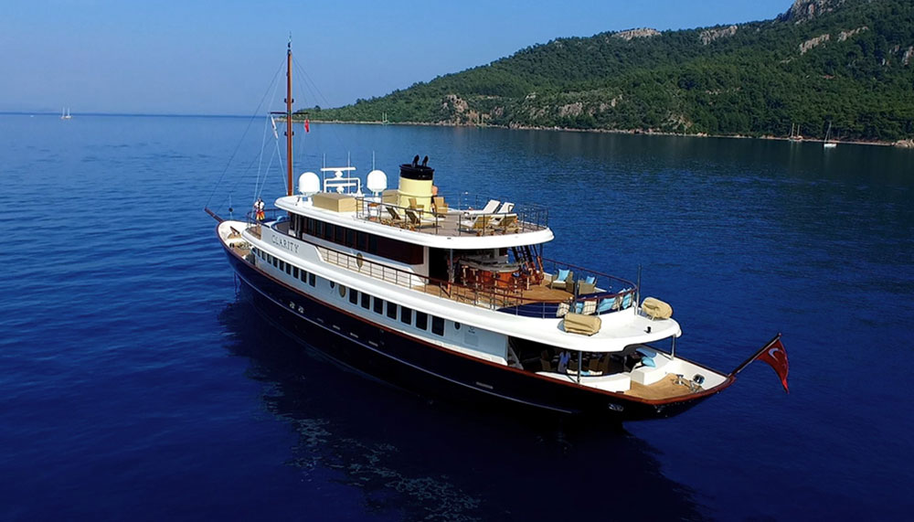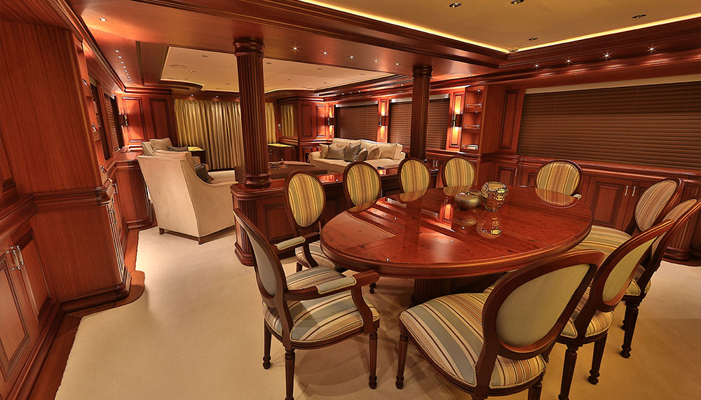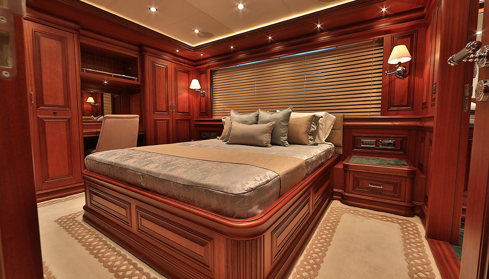 Clarity has five staterooms, one less than Timeless, creating space the Turkish yard used to great advantage: Bilgin’s designers enlarged the master suite, expanding the spacious walk-in closet while moving the owner’s bathroom to the deck below, where the crew’s quarters had been, to increase the feeling of overall space. The twin-bed stateroom in the stern of the boat became a larger cabin with a king-size bed. Other modifications include an outdoor bar on the upper deck; improved access to the galley; and loose furniture in the saloon, making it a more flexible rather than fixed decor. Alone, these are not huge changes but, combined, they certainly add to the quality of life aboard the yacht.
