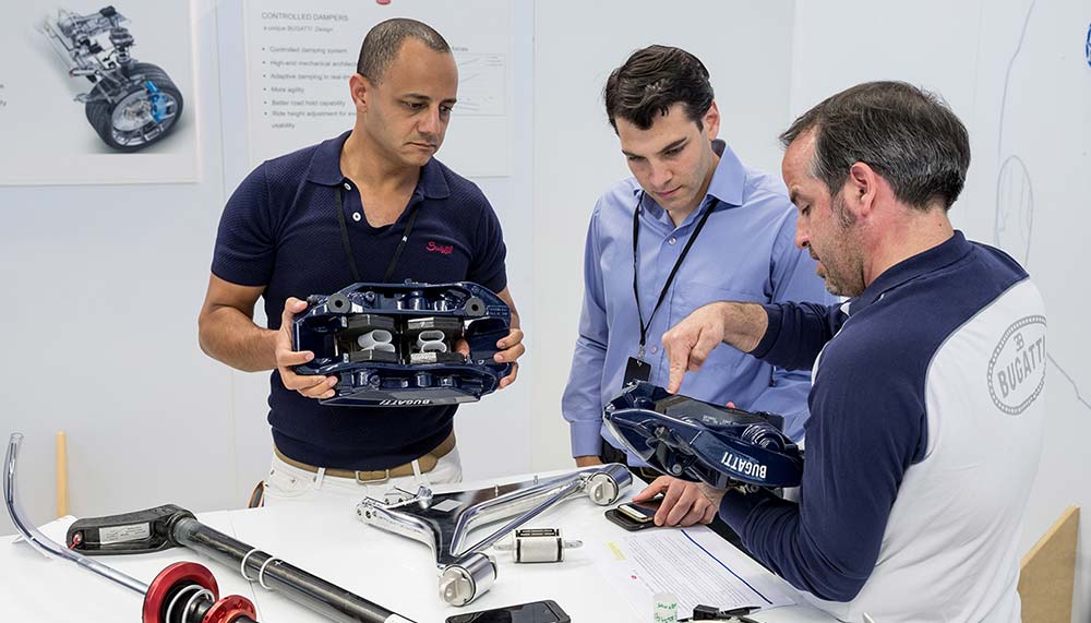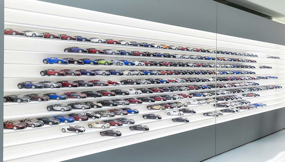 Personalising a Chiron requires a thorough – and potentially stressful – consideration of multiple exterior colour combinations, wheel choices, and interior trims, covering everything from headliner and seat styles to steering wheel stitching and brake caliper hue. Bugatti’s designers oblige with generous suggestions and insights, offering physical samples to complement the high-resolution renderings projected on a big screen. But ultimately, despite subtly directed hints and diplomatically delivered nudges, the choice ultimately falls upon the customer. Anticipation must also become part of the equation; the average wait for a Chiron is about a year and a half.