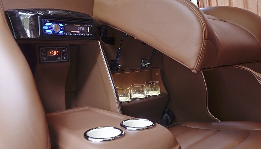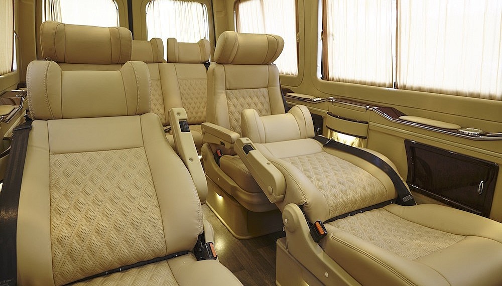 Beyond a standard limousine configuration, the appeal of bespoke interiors is just natural progression. Enter KGX Imports, a Malaysian automotive specialist known for customised interiors. Mercedes-Benz Sprinters, for example, are reworked from its original 12-seat configuration to incorporate individual pilot chairs upholstered in Nappa leather. Each seat is equipped with a control panel to activate the curtains and a folding table.