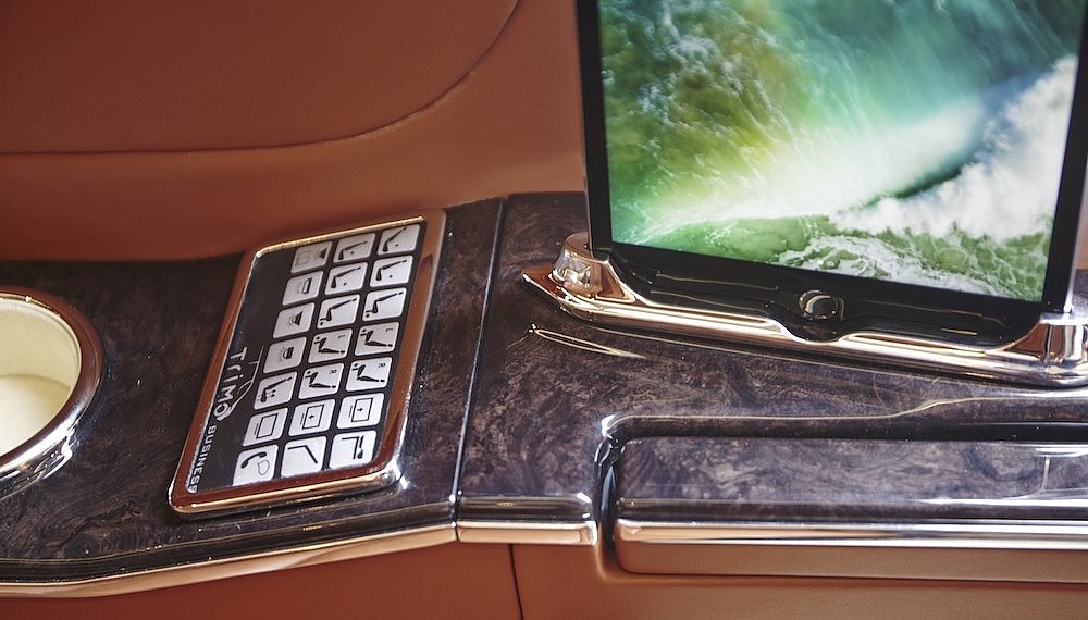 The range of upgrades include a built-in refrigerator, 42-inch screen, on-board Nespresso machine, Wi-Fi and individual USB points. Its palatial interior is a lush mix of wooden flooring with an alcantara-covered roof embedded with ambient lighting. This configuration replaces existing base trims and panels with soft-touch materials and wood veneers.