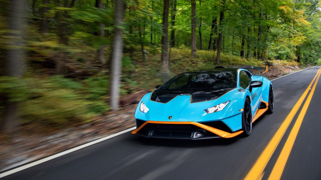 Upon entering the STO’s snug, angular cockpit at Willow Springs International Raceway in Rosamond, California, there’s little inside that hints at the differences between this rear-wheel-drive variant and the automaker’s previous benchmark for athleticism, the all-wheel-drive Huracán Performante. Yet attacking Castrol Corner, punching onto the subsequent incline and managing traction around the aptly named Rabbit’s Ear bend, the 2,952-pound coupe reveals its frenetic combination of explosiveness and gymnastic precision—like Simone Biles performing her trademark physics-defying feats while draped in aluminium and carbon fiber. With a more finely tuned version of the Performante’s 5.2-litre, naturally aspirated V-10 engine, this is the model line’s most powerful rear-wheel-drive iteration, and it has greater agility than any other raging bull in the Huracán stable, bar none.