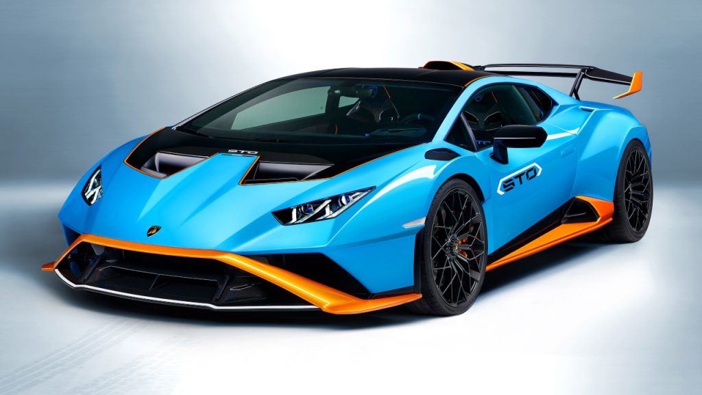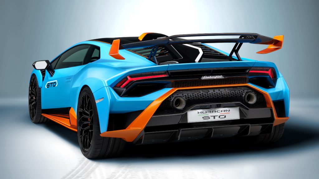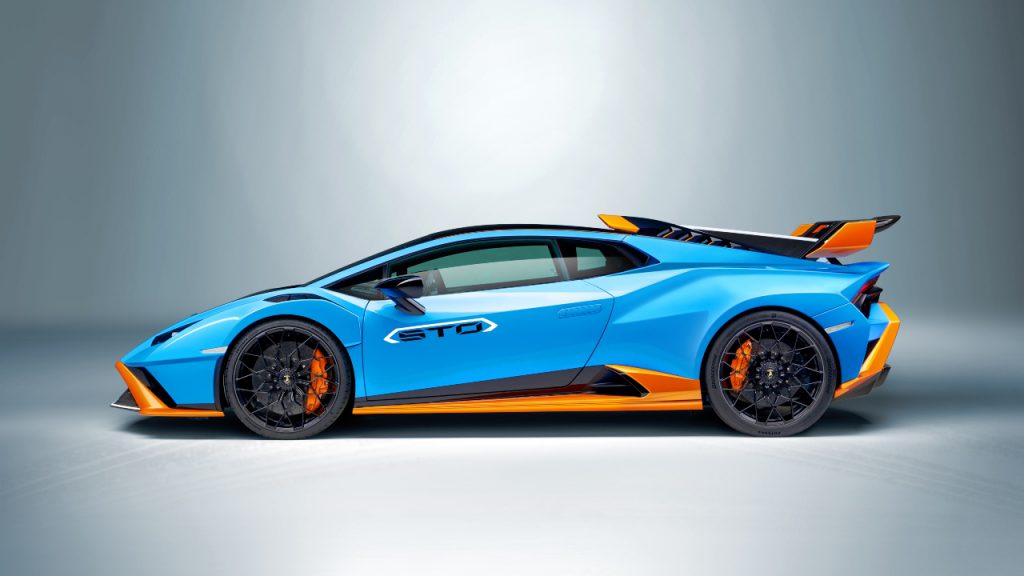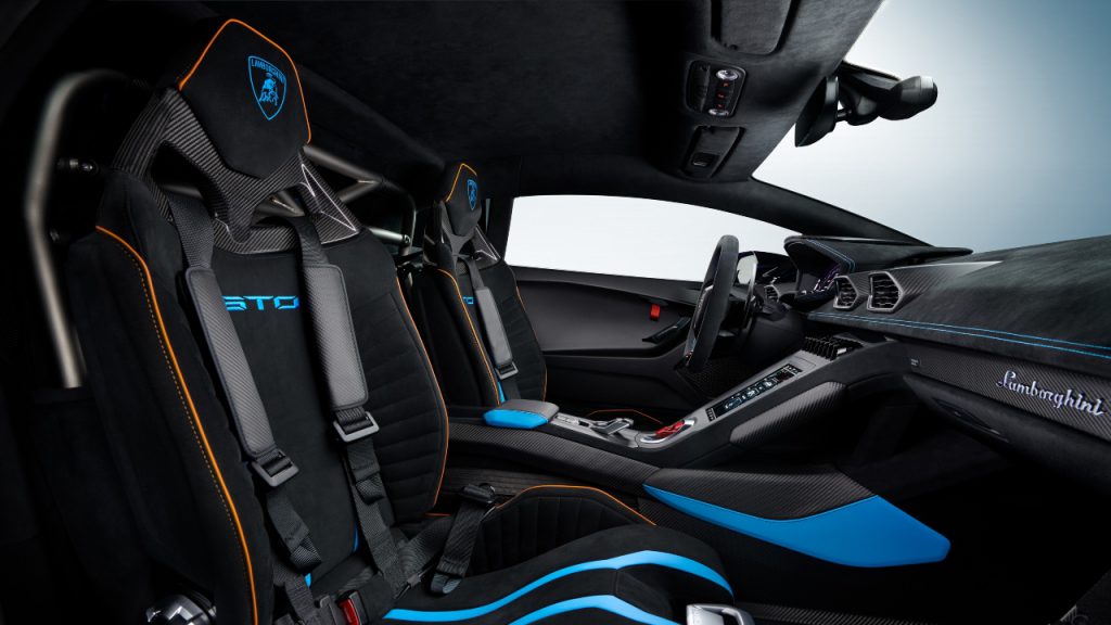 The rear-wheel-drive STO shares the same naturally-aspirated V-10 as Lamborghini’s competition cars; in this case, the engine has been boosted to produce 640 hp, which is about 9 horses more than the track-inspired Huracán Performante. Maximum torque of 417 ft-lbs is delivered at 6,500 rpm. With a seven-speed dual-clutch transmission in the mix, the STO can hit a top speed of 310 km/h, and sprint from zero to 100 km/h in three seconds flat.