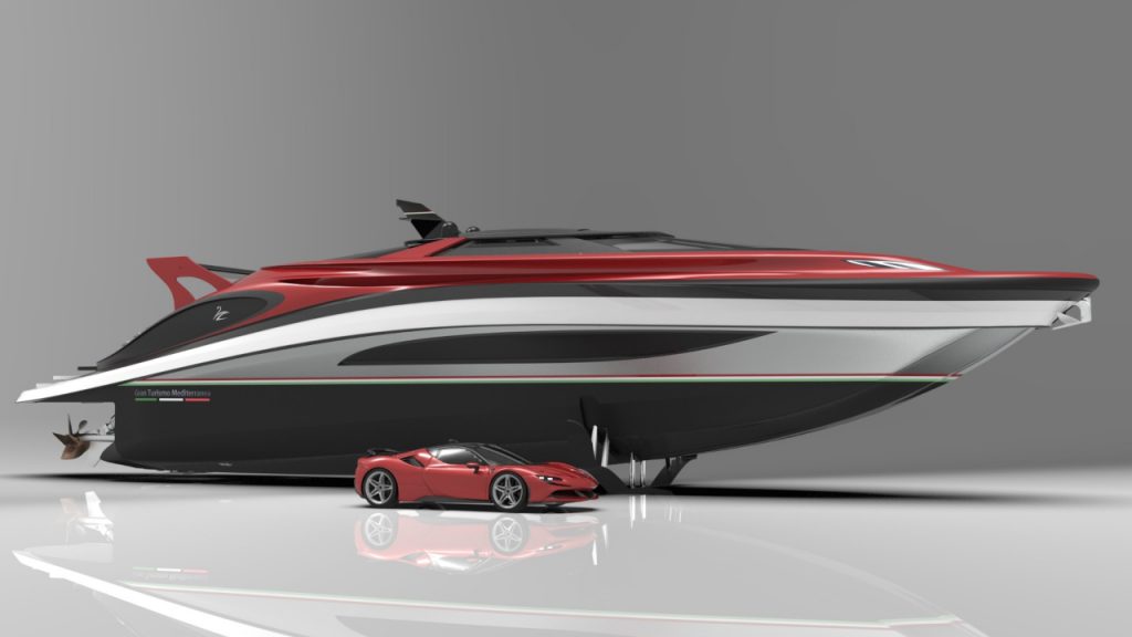 Lazzarini didn’t disclose which exact model the GTM was based on, though the car accompanying the yacht in the renders looks quite similar to the hybrid SF90 Stradale.