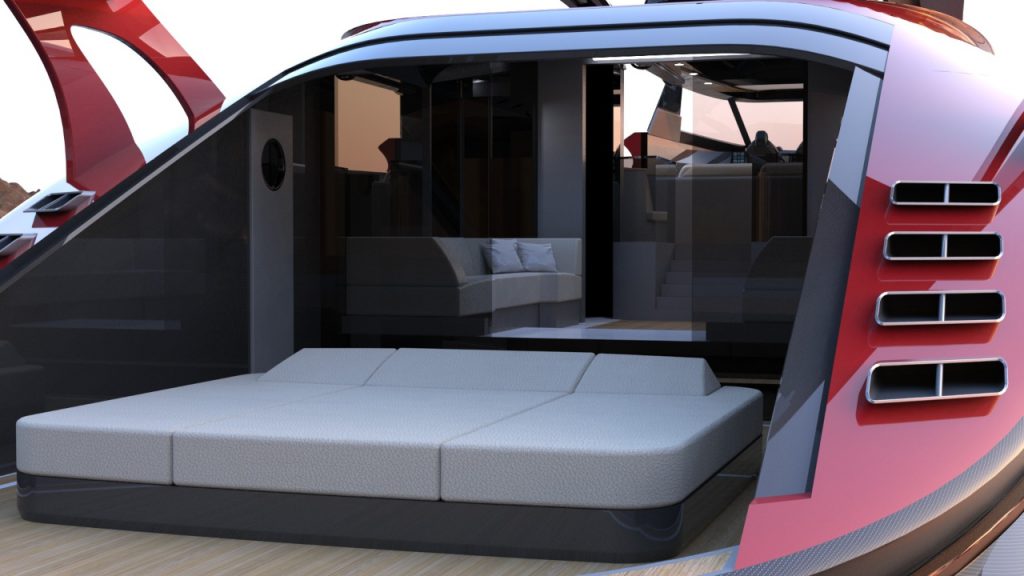 The automotive cues continue onboard. Accessible via gullwing doors, the cabin features a racing-inspired cockpit that comes complete with pilot seats and gauges, as well as a main saloon, two double guest cabins and accommodation for three crew. There is also a sizable spoiler to the stern for a little extra attitude.
