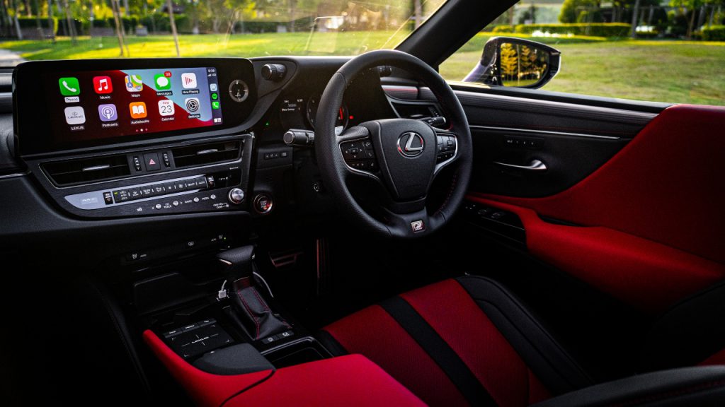 Inside the Lexus ES 250, aluminium trim and bucket seats have found their way, along with an option of two-tone red-and-black leather upholstery that is a natural choice for the F Sport. The three-spoke, leather-covered steering wheel feels luxurious, but the added perforated texture and aluminium paddles enhance the feeling of dynamism. It never veers into the territory of gauche, however – the new additions do maintain a sense of executive restraint.