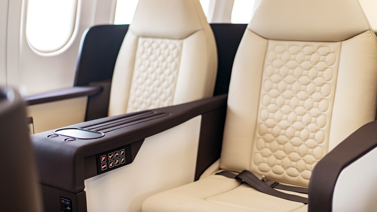 Beond enlisted Poltrona Frau to help glamorize the first aircraft on the Milan-Malé route. The renowned Italian furniture brand upholstered all 44 lie-flat business class seats on the specially designed Airbus A319. Designed by Optimares, each seat was handmade by artisans using full-grain Pelle Frau leather from Poltrona Frau. They also feature unique quilting that ensures more comfort than the typical aircraft seat, according to Beond.